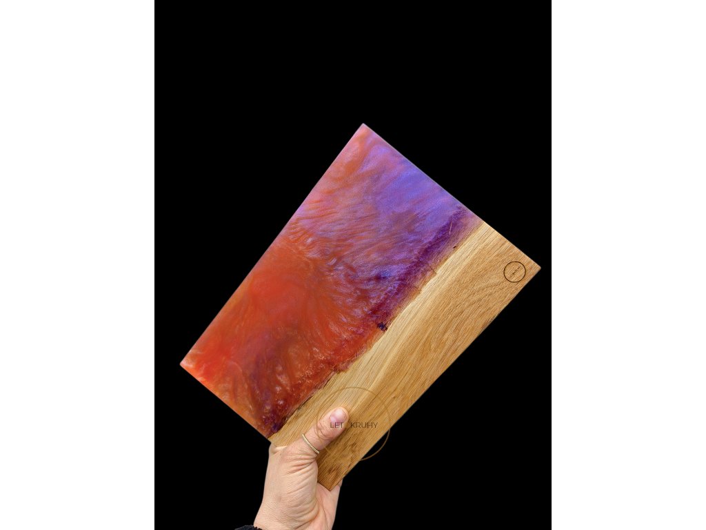 Okamžik, kdy se barvy setkají a začnou žít vlastním pohybem. Oranžová přechází do fialové, světlo se láme v hloubce epoxidu a vytváří efekt mlhoviny - živé, proměnlivé a až téměř vesmírné. Každý kus je originál. Barvy se nikdy neopakují stejně.
