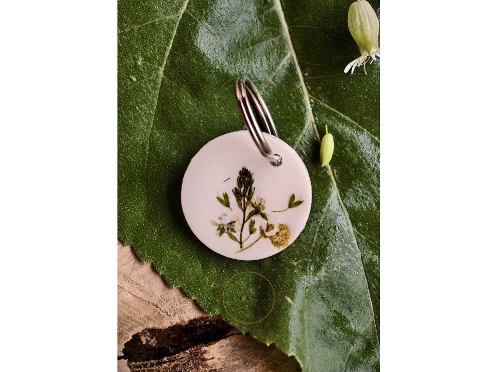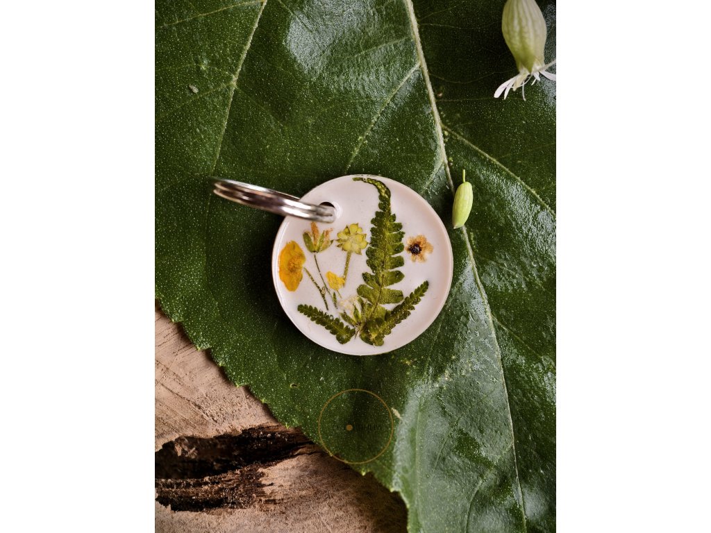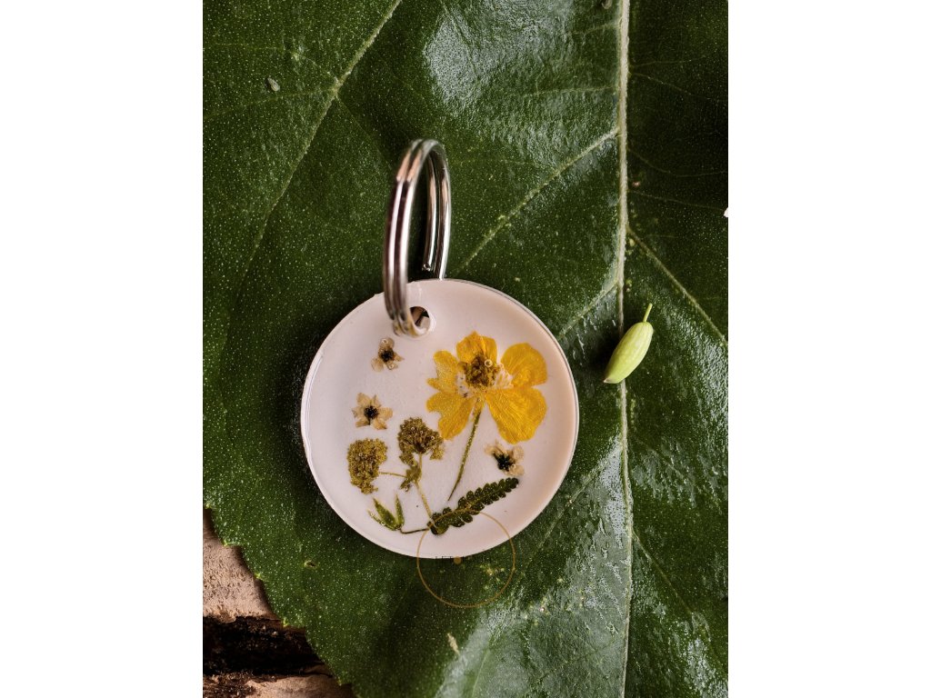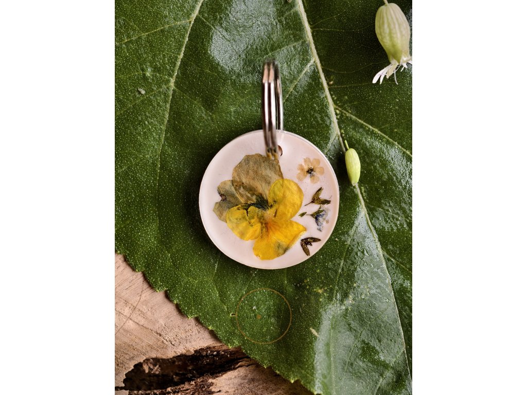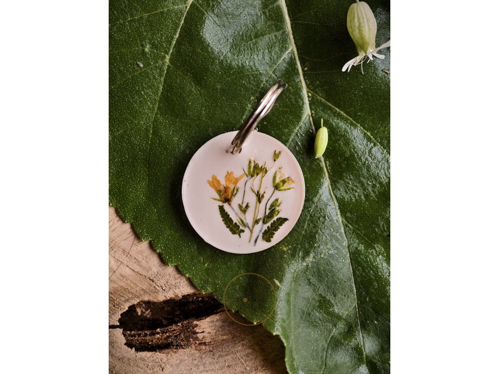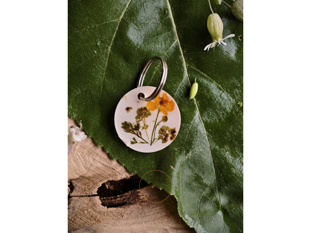 Světlý přívěšek na klíče ukrývá ve své pryskyřici sušené kvítky, které působí jako něžná vzpomínka na léto. Je to drobnost, která vám každý den připomene klid a krásu přírody – ať už jste kdekoliv.