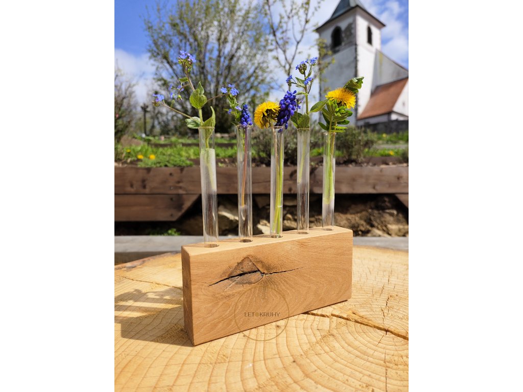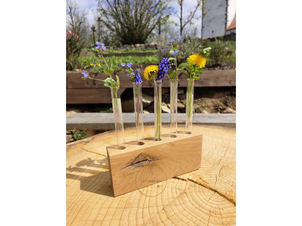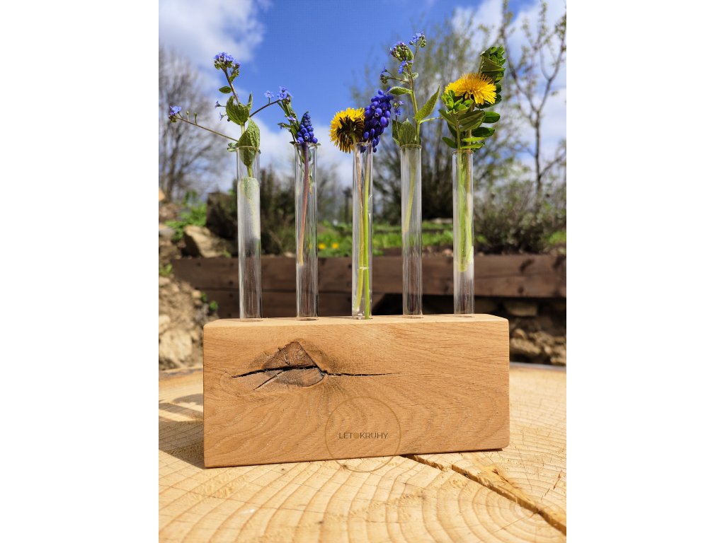 Pořádný kus dubového dřeva a pět zkumavek nesoucí ŽIVOT - květiny. Tahle váza by se klidně mohla jmenovat RADOST. Když jí máte doma na konferenčním stolku, nemůžete z ní oči spustit.